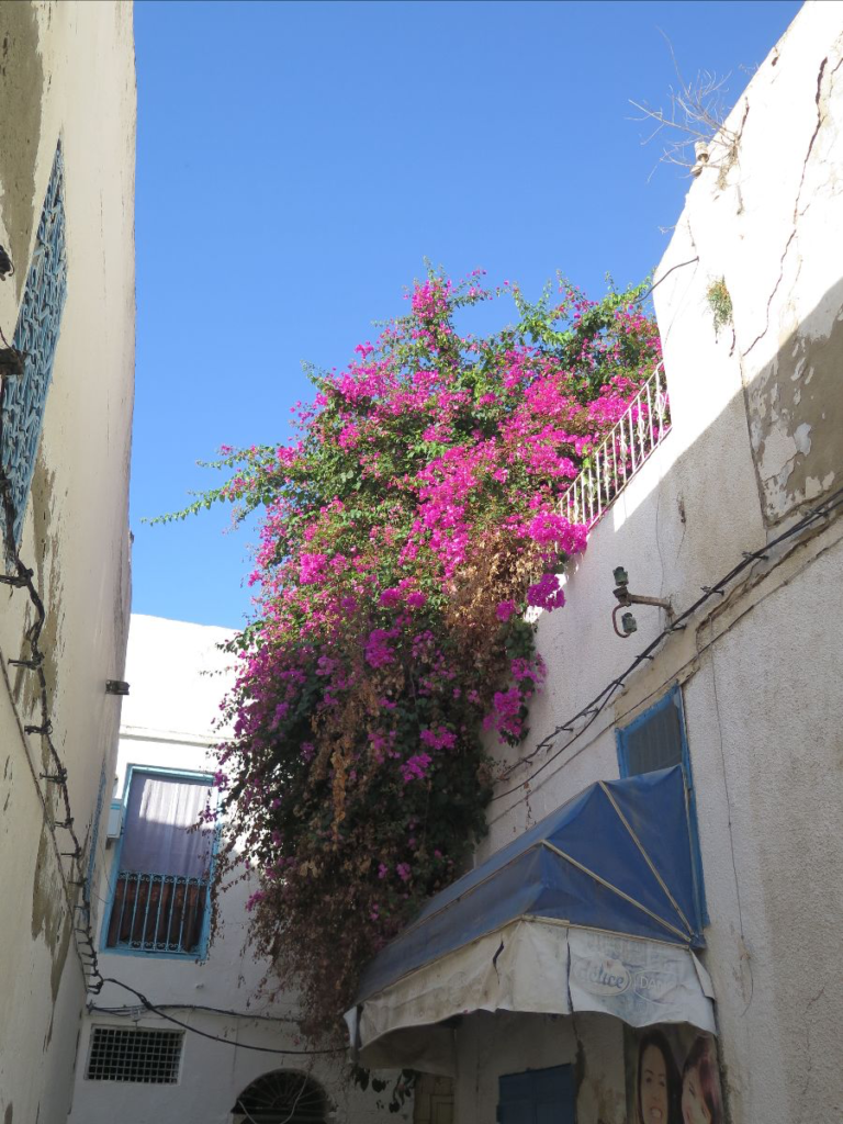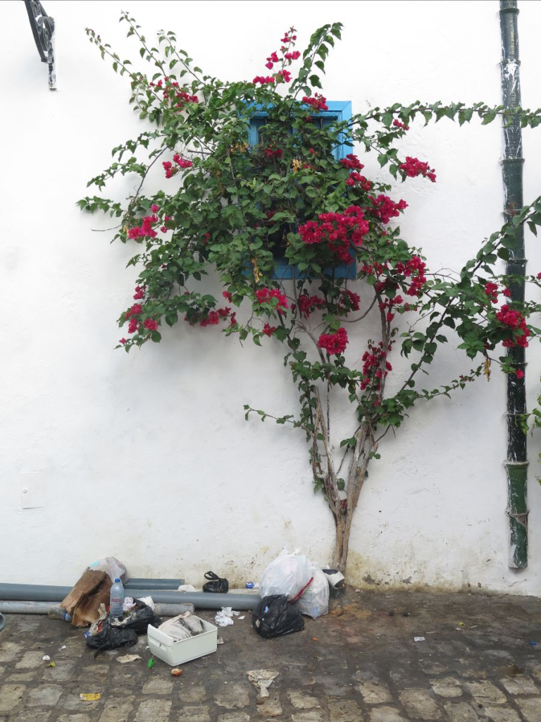 Unfortunately, the trash collection system in the medina is “leave it on the corner until someone comes and picks it up.” In this environment, it’s not surprising that bougainvilleas are thriving—they’re one of the few plants that can.