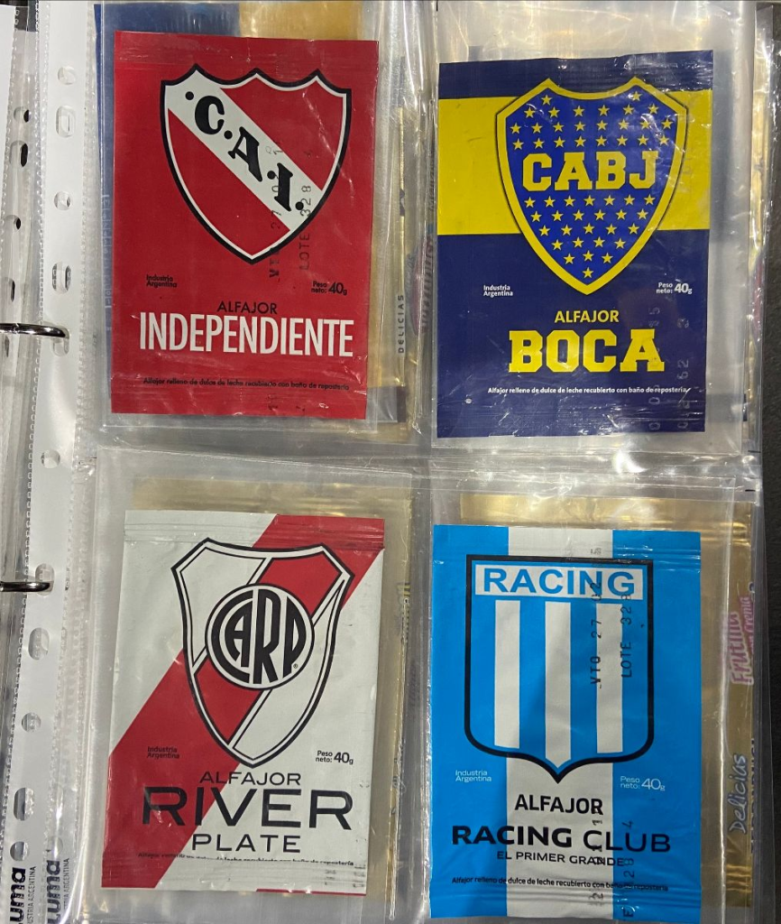 Aflajor wrappers from Independiente, Club Atlético Boca Juniors, Racing, and River Plate, the most popular Argentinian fútbol teams. Fun fact: after one too many violent confrontations, away fans are no longer allowed at the home stadiums for games.