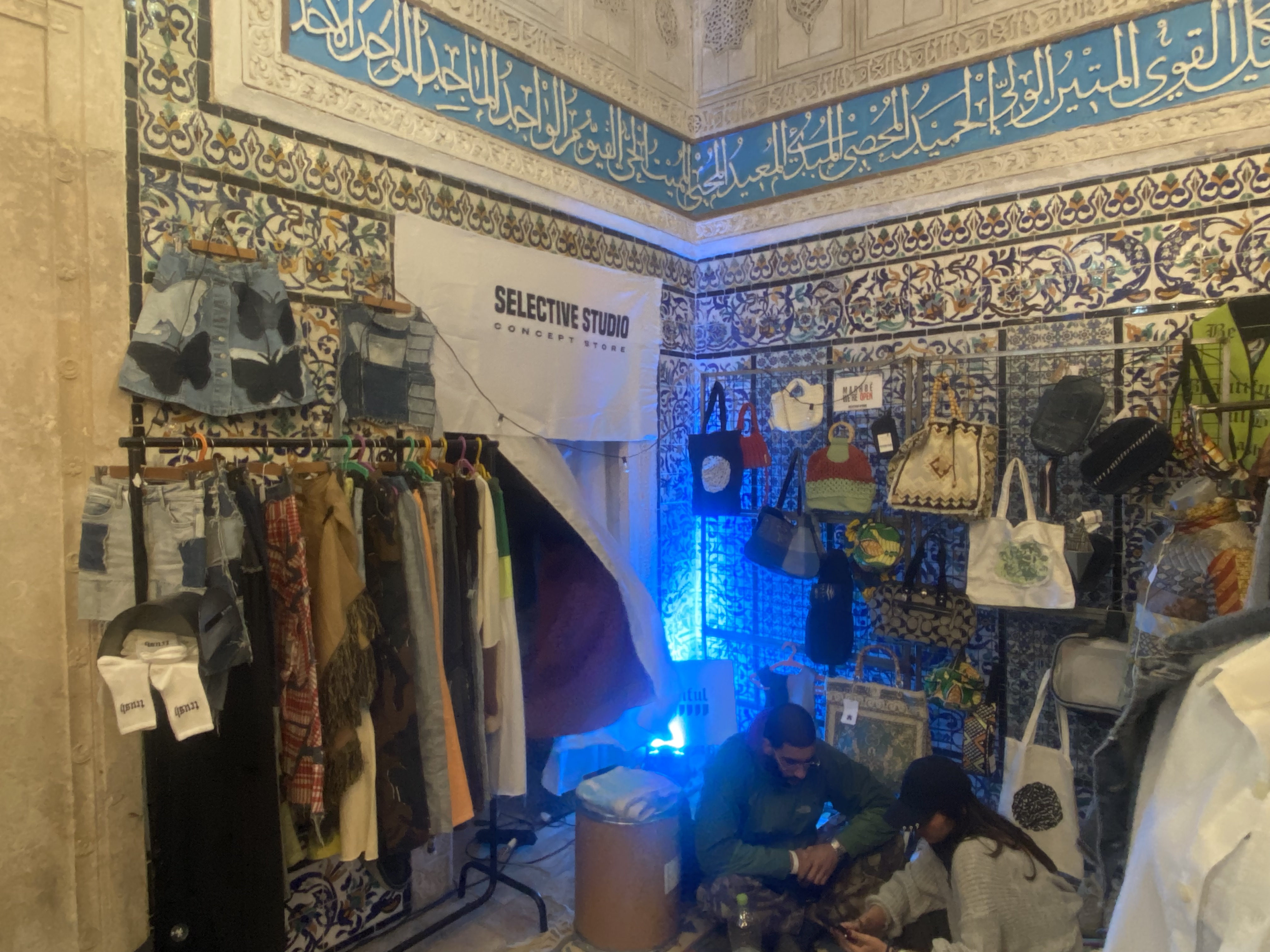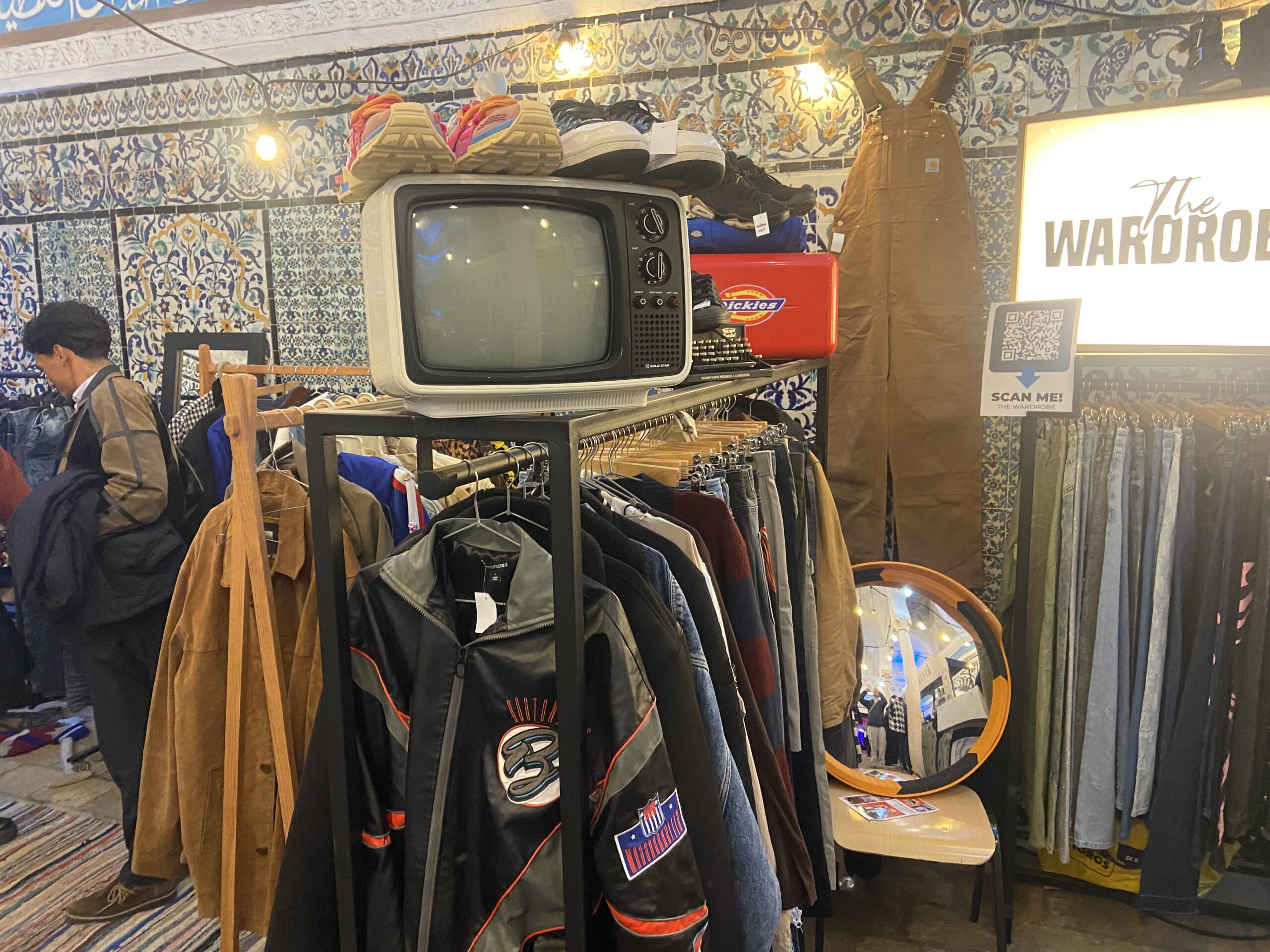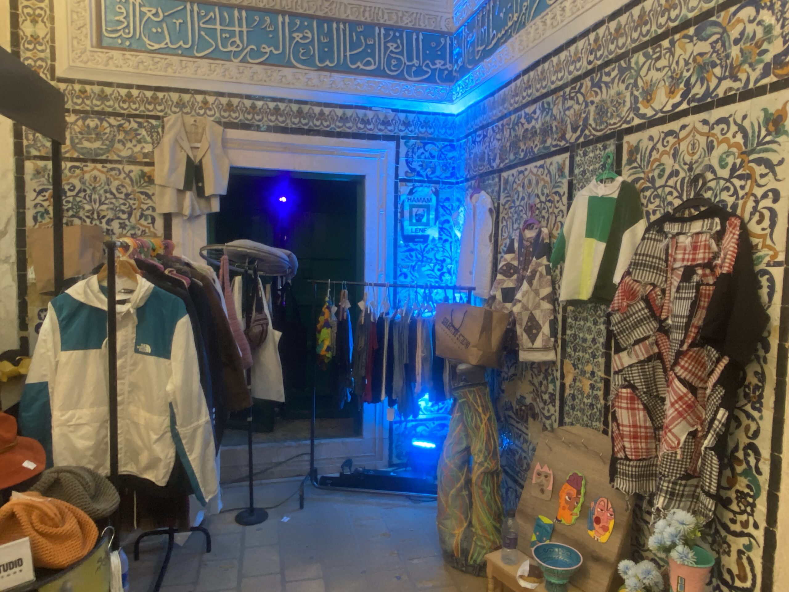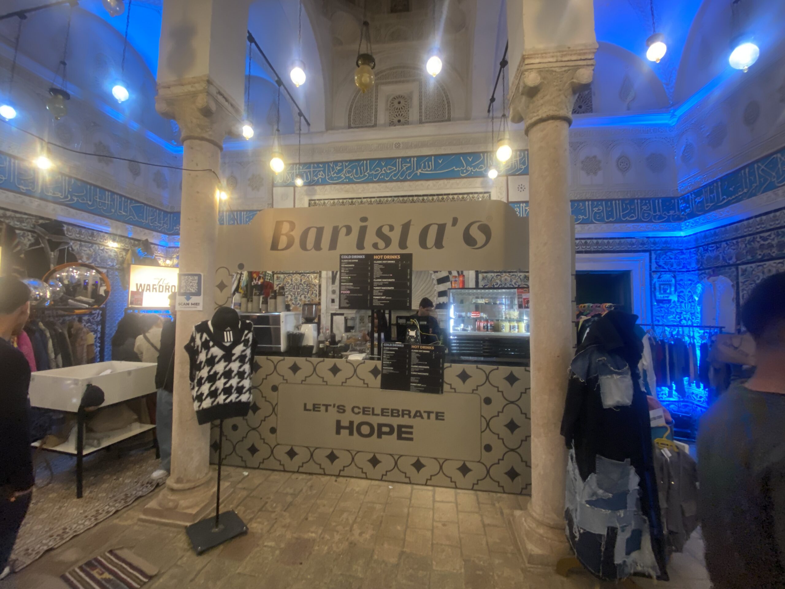 One “cultural event” stood out from the rest, not because of its connection to Tunisian heritage, but because it felt like a slice of Haight-Ashbury had been transplanted to the middle of North Africa. The event took place at Madrasa Slimania, a school constructed in 1754 by a regional Greek dynasty that ruled Tunisia under Ottoman authority (Ottoman bureaucracy is weird). When I walked in, I was greeted by a pop-up coffee shop immediately to my right. As I reflected on the inexplicable popularity of overpriced coffee in unnecessary places, I took in the rest of the room. The ceiling was intricately carved plaster, rimmed by Arabic calligraphy of the 99 names of Allah. But the floor was crowded with vintage clothes vendors, their stands overflowing with items that typically announce the arrival of gentrification to a historic California neighborhood. Leather jackets, pants with pockets in unreachable places, crocheted hats, an arts-and-crafts corner, electronics from bygone eras. Dickies and Carhartt for people who work on their computer. Shirts with enormous logos for people who hate logos. Baskets of stickers with slogans for people who hate slogans. The place yearned, like all the neighborhoods in my home state that thrive on the commercialization of coolness, to return to an era before coolness was commercialized.