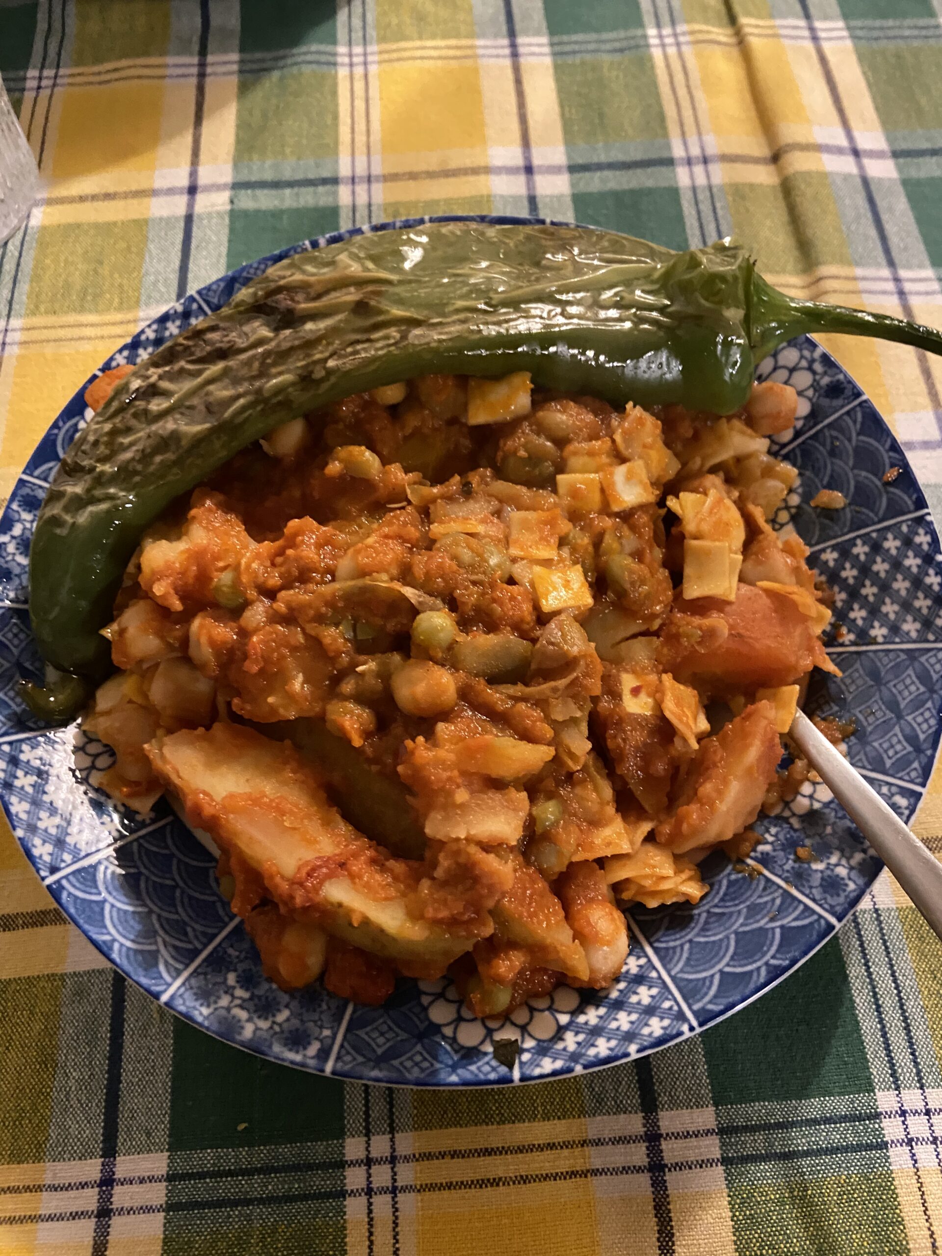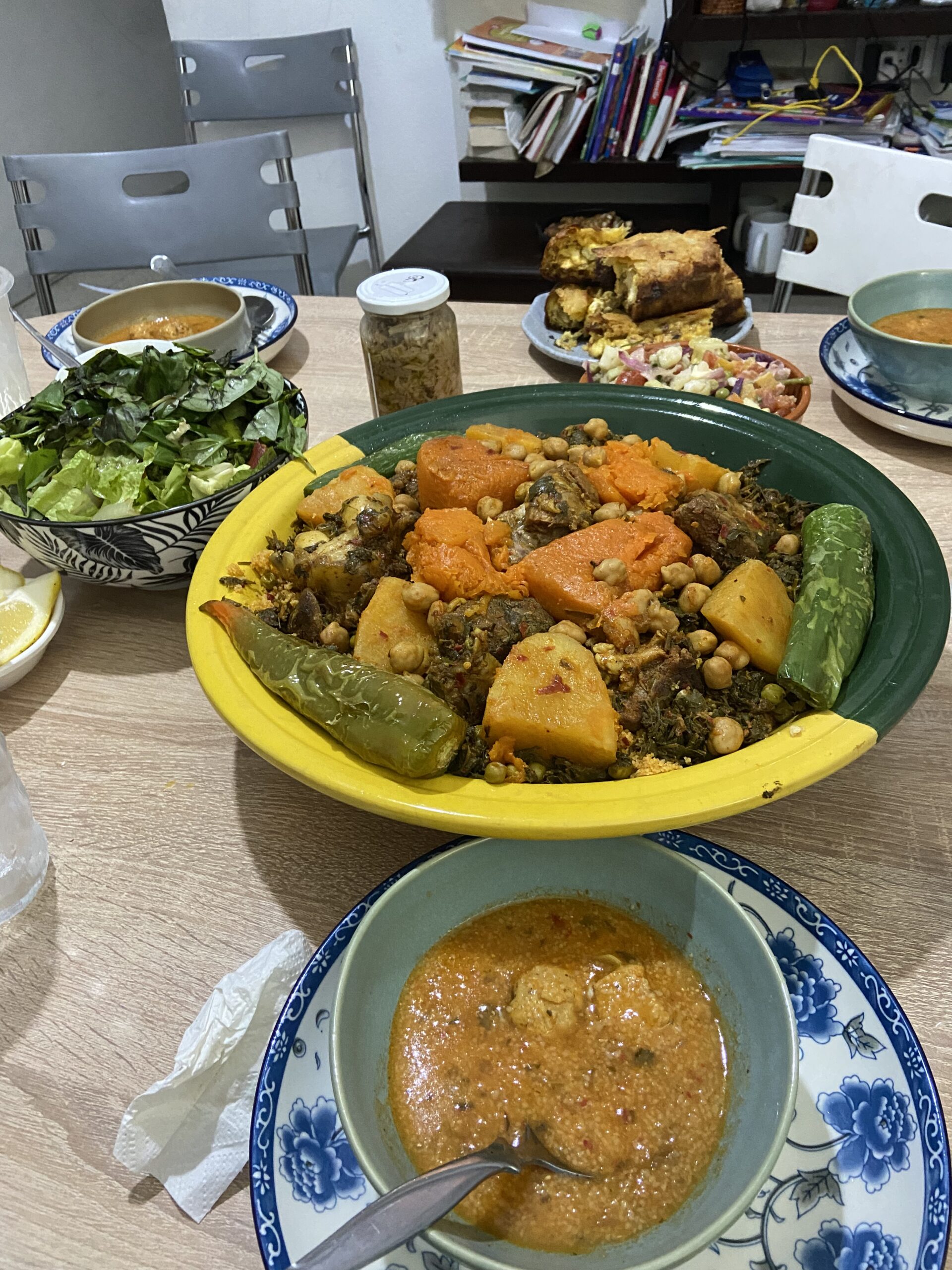 Vintage thrifting aside, the most important part of Ramadan was, obviously, the food. My most memorable iftars were with the family of my very first Tunisian friend, the family I tutor English for, and the family of my Tounsi teacher. After just a couple of weeks in Tunisia, I was certain that the country has the most hospitable people anywhere I’ve visited, and Ramadan only affirmed that. I even tried my own hand at Tunisian food and hospitality, and invited some friends over for nuasser, pasta-squares cooked by steaming them over vegetables and tomato sauce.